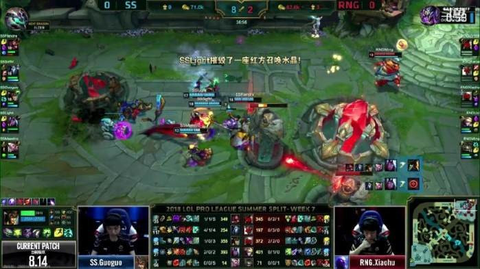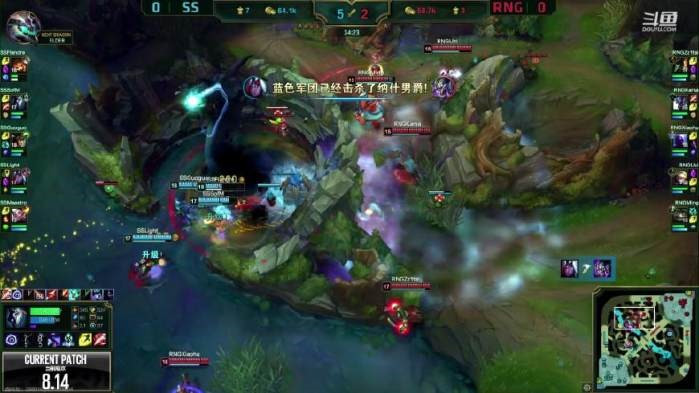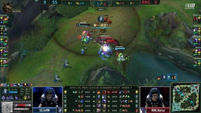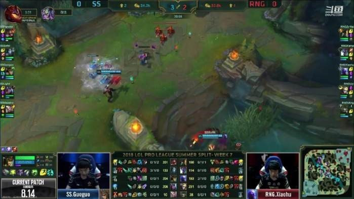 到了比赛的20分钟,SS拥有了1K多的经济优势。优势主要来源于一个人头,一个防御塔的,还有上单的补刀优势。这样的时间点这样的差距,其实是比较小的。毕竟面对的是RNG的冠军阵容,双方差距显得更小了一些。