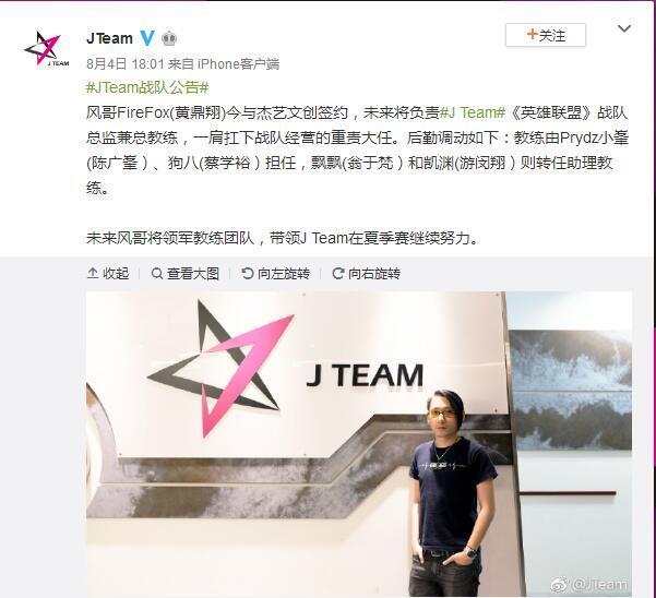 原标题:风哥任周杰伦JTeam战队总教练 台湾网友:LMS可没有UZI
