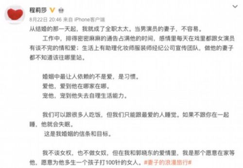 为此,首期播出当晚,程莉莎po出长文进行回应。她认为做男演员的妻子并不容易,无论工作、感情、生活,丈夫的时间与空间,都大多数被别人占据,作为妻子立脚之地甚少。但她依然心甘情愿付出所有。因为她的婚姻信条和目标,是爱郭晓东,所以值得。抛开女权的探讨,她也并不想做所谓的“女奴”,单纯因为爱,做“那个愿意在家等他,愿意为他多生一个孩子打100针的女人”。