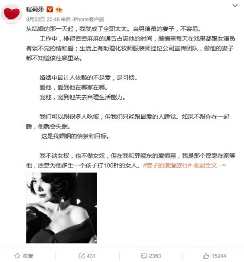 在首期上线的节目里,程莉莎自曝为了老公放弃事业,当了11年家庭主妇,并为了二胎而打了100多针,造成内分泌失调甚至已经有抑郁倾向。此言一出立即在网络上引起轩然大波。但对于网友们的质疑言论,程莉莎则是坚定的站在了维护婚姻的阵线上,发文回应称:“我愿意在家等他,愿意为他多生一个孩子打100针”。