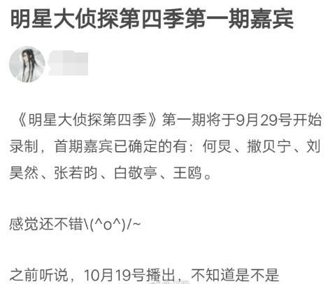 《明星大侦探》第四季的录制终于提上日程,在9月29日将开启第四季节目首期录制,《明星大侦探4》第一期节目嘉宾是:何炅、撒贝宁、刘昊然、张若昀、白敬亭、王鸥;而唯一遗憾的是鬼鬼没能够出席,有点可惜!
