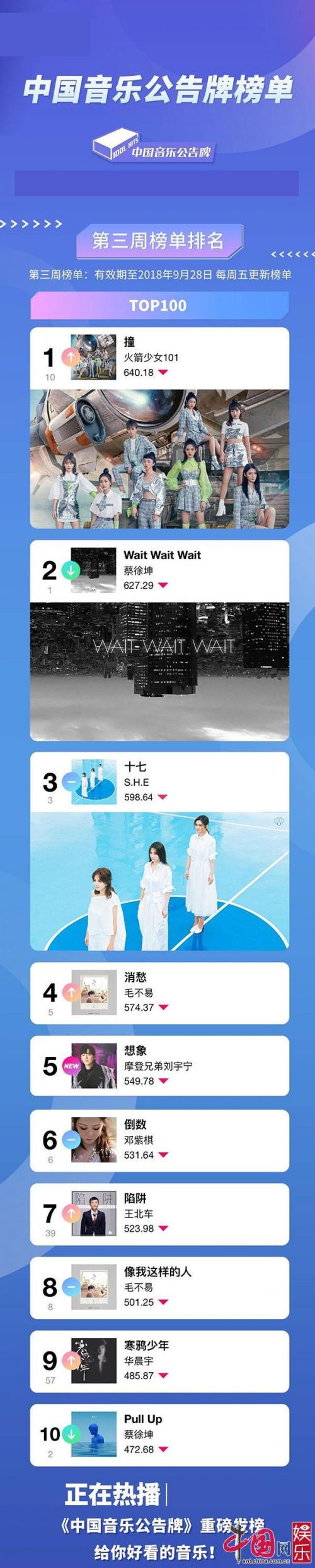 “中国音乐公告牌”榜单关注流行音乐新风向 火箭少女101《撞》跃居TOP1