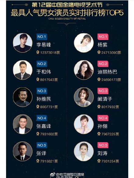 杨紫票数一天反超热巴600万 金鹰节最具人气男女明星投票地址