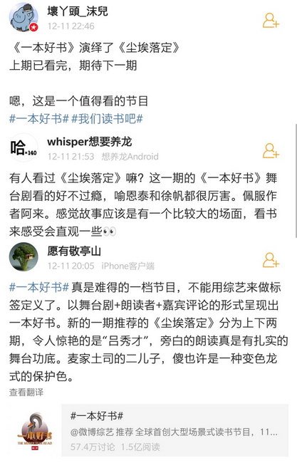 “喻恩泰虽然只是在讲述,但是他天然的带着一种真实的、天真的力量,让人不得不相信。”;“徐帆还是功力深厚啊,那段看似随意的洗手、慵懒的坐在炕上,戏剧感就出来了,感觉像一下子把我带到了书中的世界。”;在《尘埃落定》节目播出后,徐帆和喻恩泰的精彩演绎瞬间成为了网络热点,细腻的演绎让观众直呼过瘾!而精心细致的舞美,也收获了不少的好评:“场景布景简直了!这是看过最还原的最贴近真实的土司官寨布置。”《一本好书》此次为最大程度的还原《尘埃落定》,场景严格按照阿坝州藏式建筑土司官寨来打造,力图呈现出真实感和年代感。