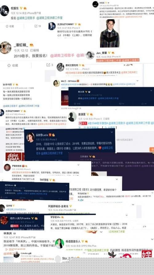 全新的自荐模式让原创歌手们达到了前所未有的活跃度,他们或谦逊、或直接、或迫切的报名宣言也让观众看到了他们对舞台的向往、对音乐的赤诚。据悉,本轮报名的统一投票时段将于12月31日开启,全程为期五天。更多精彩,关注湖南卫视1月11日起每周五晚22:00《歌手》2019。