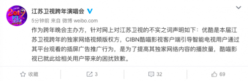 刚刚,江苏卫视跨年演唱会官微发文表示,酷喵影视此行为是为了增加网络流量,”作为跨年晚会主办方,针对网上对江苏卫视的不实之词声明如下:优酷是本届江苏卫视跨年的独家网络视频版权方,CIBN酷喵影视客户端引导智能电视用户通过其平台观看的插屏广告推广行为,是为了提高其独家网络内容的播放量,酷喵影视已就此给相关用户带来的困扰致歉。“