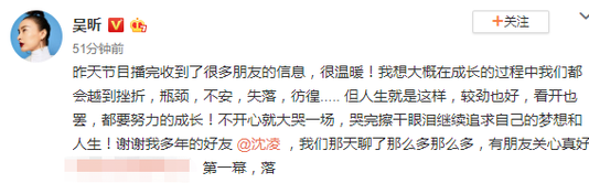 对此,吴昕发文写道,“昨天节目播完收到了很多朋友的信息,很温暖!我想大概在成长的过程中我们都会越到挫折,瓶颈,不安,失落,彷徨.....但人生就是这样,较劲也好,看开也罢,都要努力的成长!不开心就大哭一场,哭完擦干眼泪继续追求自己的梦想和人生!谢谢我多年的好友@沈凌,我们那天聊了那么多那么多,有朋友关心真好。”同时,她还配上了一张与沈凌在拍摄节目时留下的卖萌自拍照,沈凌手举着蓝色马克杯,吴昕身着毛茸茸的睡衣,素颜出镜,十分可爱。 吴昕的真情流露打动了不少观众,粉丝们也纷纷留言鼓励,“加油昕姐!”“你要开心!”