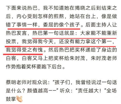 该观众表示,当时宣布迪丽热巴得了第一的时候,迪丽热巴的表情是像做错事了的孩子,而且要求大家重新投票,认为自己受之有愧,还没有能力拿这个第一。并且把奖杯递给了白客,白客又给了朱时茂。最后是蔡明来解的围。