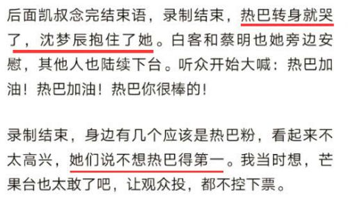 最后录制结束的时候,迪丽热巴转身就哭了。而周围的热巴粉的表现也不是太高兴,因为他们并不想让热巴得第一。
