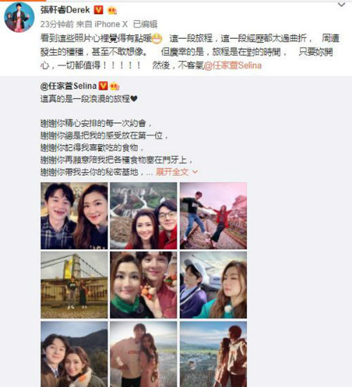 Selina在微博发文称:“这真的是一段浪漫的旅程,谢谢你精心安排的每一次约会,谢谢你总是把我的感受放在第一位,谢谢你记得我喜欢吃的食物,谢谢你再愿意陪我把各种食物塞在门牙上,谢谢你带我去你的秘密基地,谢谢你每次吃饭陪我喝发酵葡萄汁,谢谢你对我敞开心扉天南地北地聊天,谢谢你当我问你我今天是不是很肿你都说不会啊我觉得很好看,谢谢你帮我找到浪漫的自己,谢谢你让我喜欢现在的自己,谢谢你出现在我的生命,谢谢你,@张轩睿Derek”。