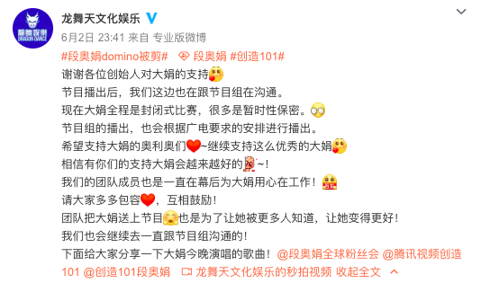 《创造101》播出56进36的节目中,段奥娟排名第五,一曲《domino》颠覆之前乖巧可人的形象,性感妩媚。但随后有网友曝出,段奥娟预告里出现的表演片段在正片里被剪掉了,此举引发段奥娟粉丝不满。其经纪公司随后发布微博称,目前就该事件正在与节目组进行沟通,感谢粉丝的支持。