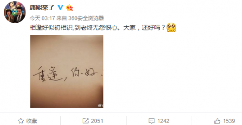 而配字是“相逢好似初相识,到老终无怨恨心。大家,还好吗?”还配上了一个很无辜的表情!顿时引发了网友的热情,大家都纷纷开始猜测,这发出来的意思是什么?难道是《康熙来了》要回归了吗?