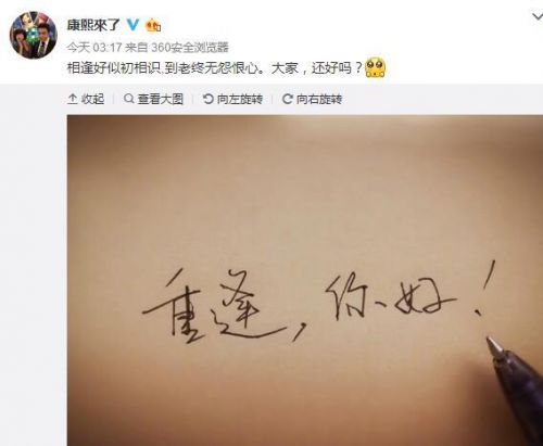 时隔一年多,9月6日,好久不更微博的《康熙来了》节目组突然在微博上发文称:“相逢好似初相识,到老终无怨恨心。大家,还好吗?”并配上一张“重逢,你好”的照片,让粉丝猜测《康熙来了》是否将再次重出江湖。