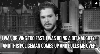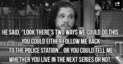《权力的游戏》第六季开播前,基特·哈灵顿一口咬定他饰演的雪诺死了,与“官方口径”保持高度一致。不过,哈灵顿也有顽皮的时候,在一档访谈节目里,他一脸淡然地说,一次开车超速,于是用剧透逃罚单。“要么跟我回警局,我把你登记在案,要么告诉我,雪诺下一季是死是活。”警察指了两条路,雪诺当然“从善如流”,选择了大家都会选的解决方案,告诉他“我复活了”。他还说,警察告诫他开车慢点。