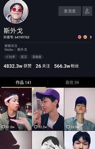 丑帅、业余舞蹈老师、雷震子小夫同款嘴是网友给他最多的标签。截至目前,斯外戈抖音粉丝531.5万,发布作品共获赞4414万次。当之无愧“2018抖音十大网红之一”。