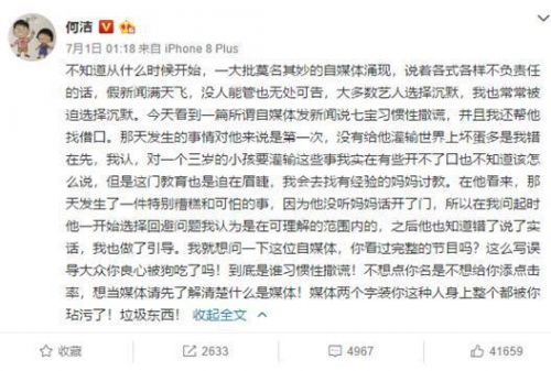 然而这个发生在孩子身上本就正常的一次谎言,却被一些自媒体解读为“习惯性撒谎”,对此何洁发文怒斥,她先是承认了自己在育儿中还存在的一些错误,但部分自媒体“说着各式各样不负责任的话”,将七宝的行为解读为“习惯性撒谎”,何洁也直斥其违背良心误导大众,配不上媒体两字。