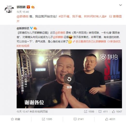近日,由优酷联合欢乐传媒、笑果文化共同出品的年轻态喜剧综合秀《周六夜现场》,曝光了一段节目录制现场的花絮。视频中,郭德纲对着镜头喊话观众,为儿子郭麒麟征婚,语气十分诚恳。视频曝光后,网友纷纷评论称:“爸爸!我觉得我可以!”“爸爸我来了。”相声霸主郭德纲一夜之间变身“国民爸爸”,儿子郭麒麟更是转发微博称:“爸,我这就开始交往”,引发网友热议。