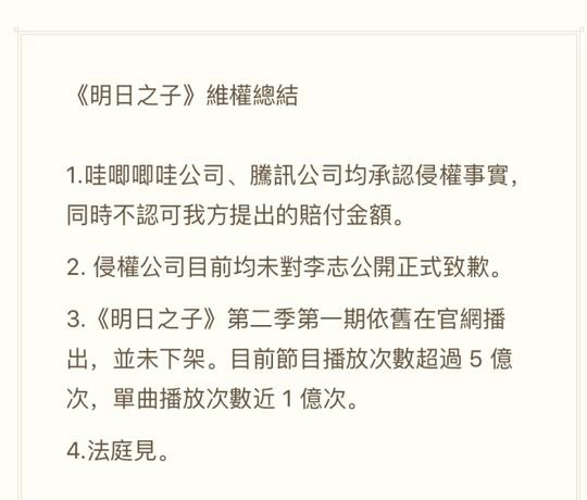 音乐人李志发文总结《明日之子》侵权事件。他称“哇唧唧哇和腾讯承认侵权,但不认可赔付金额,且侵权公司未公开正式致歉,同时《明日之子》第二季第一期依旧在官网播出,并未下架”,将起诉至法院继续维权。