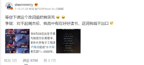 节目播出当晚,李健改周杰伦《等你下课》歌词的截图几乎已经在微博上被转疯。导师开场秀环节,他直接把原歌词中“高中三年我为什么不好好读书”,改成了“过去三年我为什么不说喜欢你”,一首甜蜜的情歌瞬间让全体观众笑喷。而作为清华大学的高材生,李健也是相当耿直了,直接在片子里表示,“高中三年不好好读书”对他来说有点违和。不少网友还纷纷调侃:“李健已经手下留情了,没改成“高中三年我为什么 为什么不好好读书 还是考上了清华大学”就不错了!